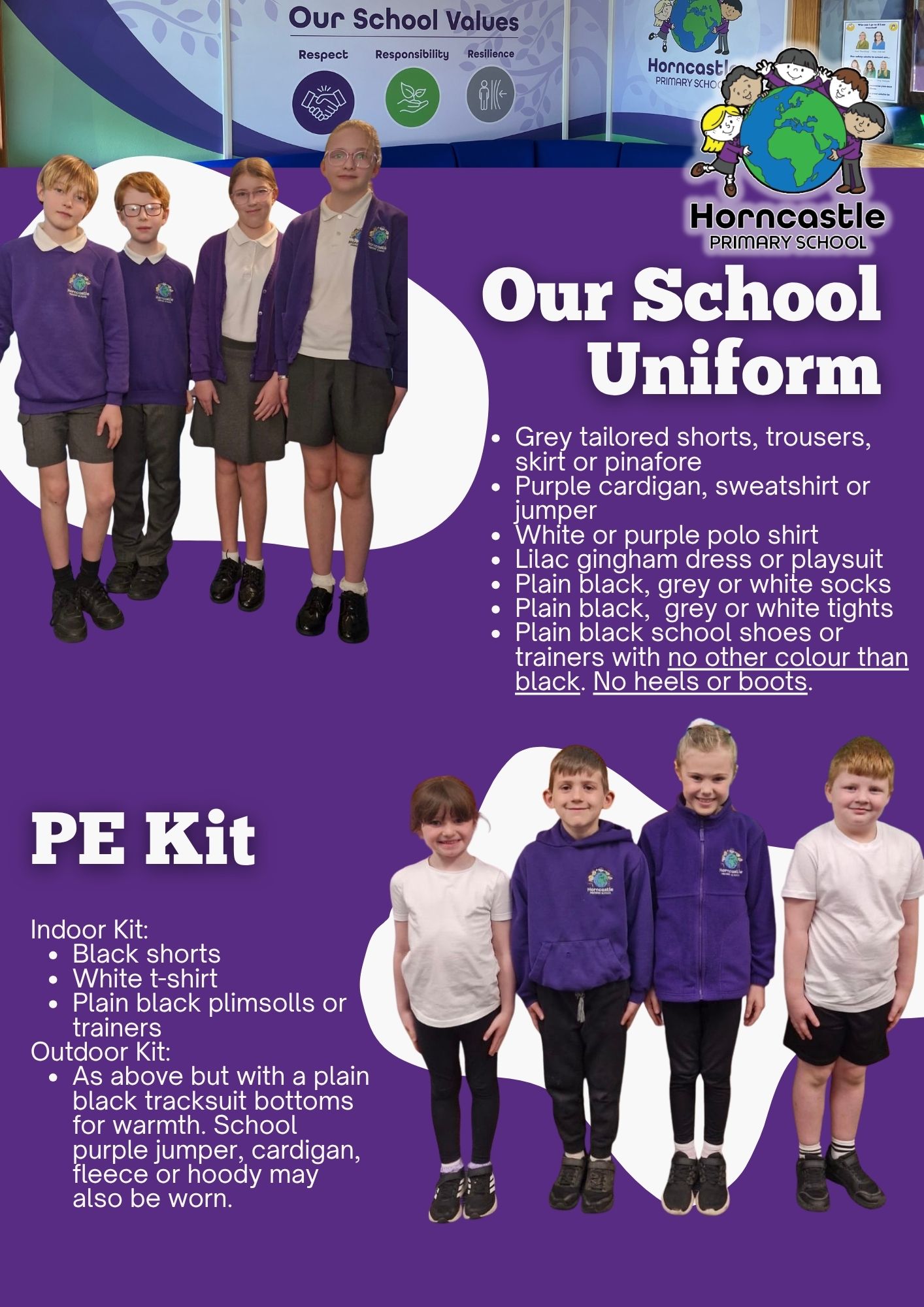The full School Uniform Policy can be downloaded from our Horncastle Primary School Policies page. The following picture gives an idea of items available to purchse both with logos and without. Please see Nationwide School Uniform’s web site for the full list of items available from them and up to date pricing. Orders can be made and paid for online. You can pick them up from their premises in Spilsby or you can have these delivered to your home or (during term time) to school to be sent home with your child.